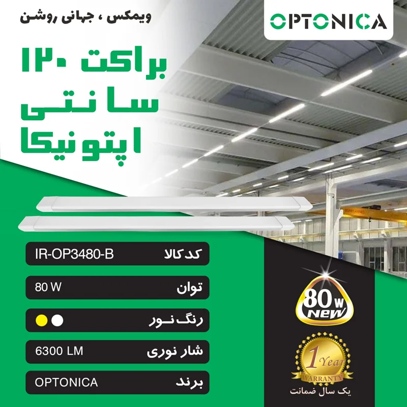 براکت ۸۰ وات ۱۲۰ سانتی اپتونیکا برپایه تکنولوژی SMD LED توانسته است نوری یکنواخت و سالم را در مقایسه با لامپ های فلورسنت به ارمغان بیاورد. مدتی است قاب های مهتابی LED در تنوع شکل و اندازه های مختلف تولید و روانه بازار شده و به سرعت به دلیل مزیت های قابل ملاحظه ای که دارند جایگزین نسل قدیم چراغ های مهتابی شده اند. مزیت هایی نظیر ظرافت و زیبایی، مصرف انرژی به مراتب کمتر، نور دهی آنی و بدون تأخیر، تولید گرمای ناچیز، نمود رنگ بالا که به واقعی بودن رنگ اجسام محیط منجر می شود، عدم وجود اشعه ماورای بنفش، ایمنی و استحکام بالا در برابر ضربه و شکستگی و سهولت نصب، مصرف کنندگان و تولیدکنندگان مسکن را به سمت استفاده از مهتابی LED سوق داده است. این مهتابی با بدنه یکپارچه محصولی فوق العاده جهت استفاده در نورپردازی های ساختمان و یا استفاده به عنوان مهتابی می باشد. از این محصول در تمامی مکان های تجاری، مسکونی(اتاق خواب و نشیمن)، اداری، یا راهرو بیمارستان ها و… می توان استفاده کرد