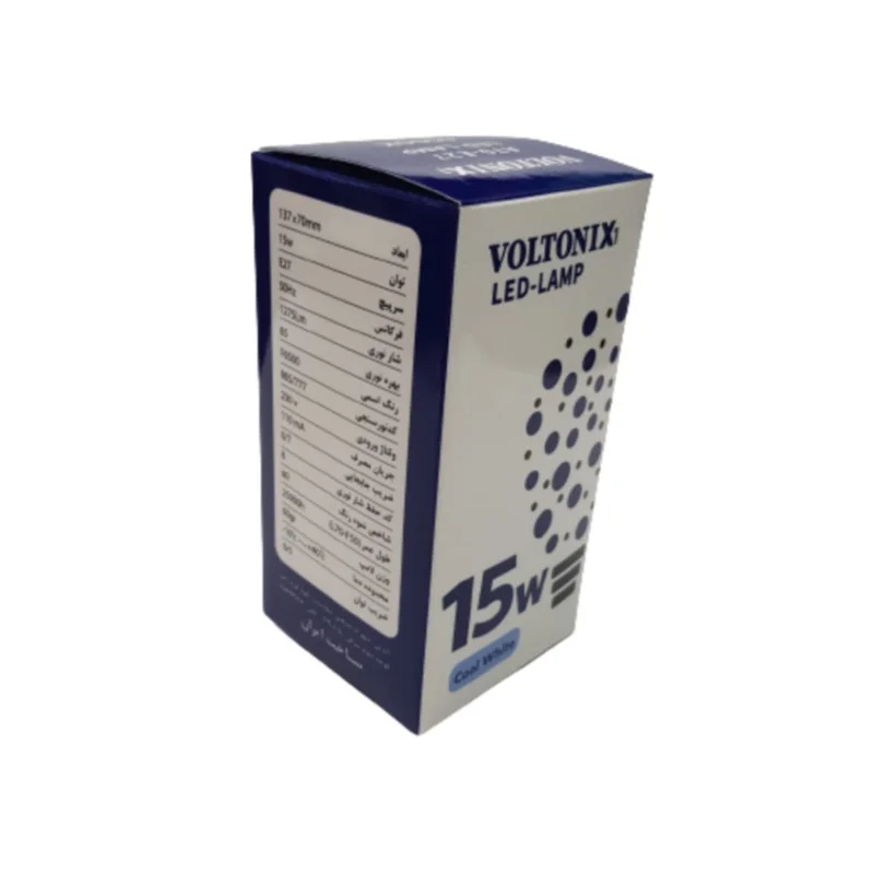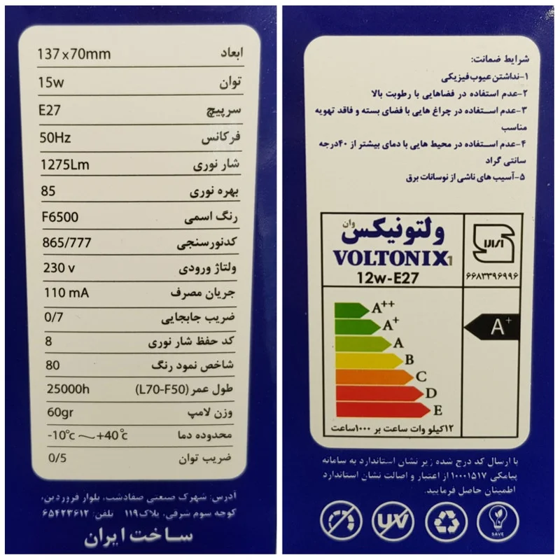 از مشخصات بارز محصولات ولتونیکس وان، میتوان به طول عمر بالا، مصرف انرژی پایین، مناسب برای محیط زیست (بدون هیچگونه مواد مضر و تولید کمترین گاز CO2)، و همچنین عدم انتشار هرگونه پرتو خطرناک اشاره نمود. لامپ ال ای دی 15 وات «ولتونیکس وان» با پایه E27 از سری لامپهای الایدی شرکت ولتونیکس وان (VOLTONIX1) است که با داشتن رده انرژی +A از جمله لامپهای فوق کممصرف محسوب میشود و طراحی آن شبیه به لامپهای رشتهای معمولی است اما با داشتن روشنایی بیشتر نسبت به لامپهای قدیمیتر و مصرف انرژی پایینتر میتواند بهترین جایگزین برای آنها به شمار رود. نورپردازی و استفاده از منابع مناسب برای روشنایی و همچنین نورپردازیها و روشناییهای تزئینی، همواره به اندازه معماری و دکوراسیون اماکن مختلف از منزل تا اماکن تجاری صنعتی، دارای اهمیت زیادی برای زیبایی و حتی کاربری آن اماکن بوده است. اکنون آنچه بیش از پیش مورد توجه مصرفکنندگان مختلف خانگی و صنعتی قرار گرفته، استفاده از لامپهایی است که ضمن بیشترین نوردهی، از مصرفی پایین و طول عمر بیشتری بهرهمند باشد. لامپ ال ای دی 15 وات «ولتونیکس وان» با پایه E27 ضمن نوردهی با زاویه خیلی خوب، میتواند نوری زیبا را برای مصرفکننده به همراه داشته باشد و با توجه به کاربری اینگونه لامپها که بیشتر در روشناییها و نورپردازیهای تزئینی دارند مورد استفاده قرار میگیرند، از نظر مصرف کمتر انرژی، تولید حرارت کمتر، و طول عمر بیشتر میتوانند جایگزینی بسیار مناسب و حتی ضروری برای لامپهای سنتی یا رشتهای به شمار آیند. از دیگر مشخصات اصلی لامپهای LED میتوان به عدم انتشار پرتوهای زیانآور ماورای بنفش (UV) و مادون قرمز، و همچنین تولید کمترین دیاکسیدکربن در مقایسه با لامپهای معمولی اشاره نمود. هریک از این لامپهای الایدی 15 وات میتواند روشنایی خوبی معادل یک لامپ 120 وات معمولی داشته باشد.گارانتی ولتونیکس وان تا پایان تاریخ مندرج بر روی لامپ دارای ضمانت میباشد