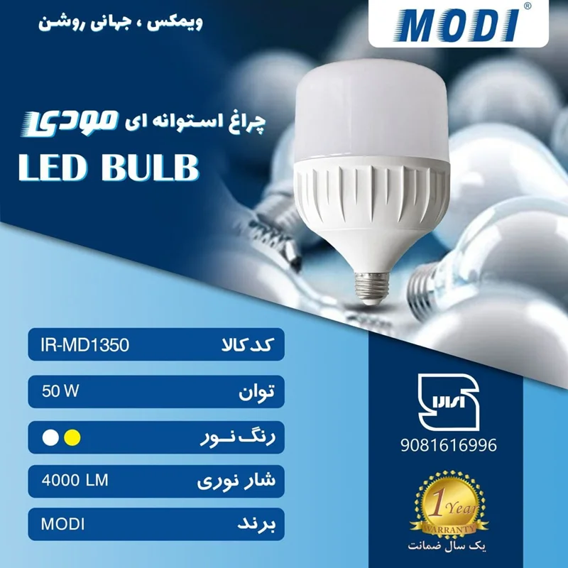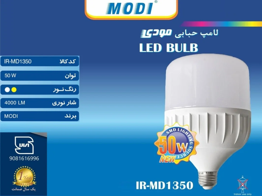 لامپ استوانهای ۵۰ وات مودی با کد IR-MD1350 » و در دو رنگ نور آفتابی ( ۳۰۰۰ ) و مهتابی (۶۵۰۰ ) به بازار عرضه میشود. این لامپ راندمان بالایی دارد و بیشترین مقدار انرژی مصرفی را صرف تولید نور میکند ؛ ازاینرو حرارت تولیدی کمی دارد. این محصول توانسته در ردهی انرژی A+ قرار گیرد و در کنار این راندمان مناسب، از طول عمر بالایی برخوردار است. همچنین این محصول دارای نشان استاندارد بوده و دارای یک سال ضمانت می باشد. طول عمر این محصول ۲۵۰۰۰ ساعت بوده و کیفیت ساخت مناسبی دارد. از دیگر مشخصات این لامپ میتوان به پایهی E27 آن اشاره کرد که برای نصب روی سرپیچهای معمولی و رایج کشور مناسب است. حباب قرارگرفته روی این لامپ مقاومت بالایی در برابر ضربه دارد و میتوان آن را در مکانهایی که احتمال برخورد ضربه با لامپ وجود دارد، استفاده کرد. این محصول موفق به اخذ استاندارد RoHS شده و دلیل آن استفادهنکردن از عناصر مضر سرب و جیوه در ساخت لامپ است. نور خروجی این محصول معادل یک لامپ ۲۵۰ وات رشتهای اندازهگیری شده است.