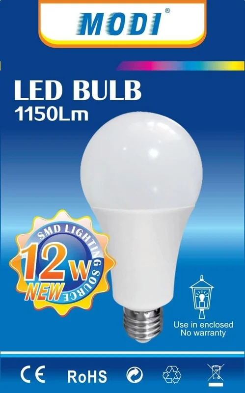 لامپ ال ای دی 12 وات محصول شرکت مودی (MODI) با کد مدل IR-MD1212، در دو رنگ نور آفتابی(۳۰۰۰) و مهتابی(۶۵۰۰) به بازار عرضه میشود. این لامپ راندمان بالایی دارد و بیشترین مقدار انرژی مصرفی را صرف تولید نور میکند؛ ردهی انرژی این محصول A+ بوده و در کنار راندمان مناسب، از طول عمر بالایی برخوردار است. نشان استاندارد و یک سال ضمانت از دیگر ویژگی های این لامپ می باشد، طول عمر این محصول ۲۵۰۰۰ ساعت بوده و کیفیت ساخت مناسبی دارد. از دیگر مشخصات این لامپ میتوان به پایهی E27 آن اشاره کرد که برای نصب روی سرپیچهای معمولی و رایج کشور مناسب است. حباب قرارگرفته روی این لامپ مقاومت بالایی در برابر ضربه دارد و میتوان آن را در مکانهایی که احتمال برخورد ضربه با لامپ وجود دارد، استفاده کرد. این محصول موفق به اخذ استاندارد RoHS شده و دلیل آن استفاده نکردن از عناصر مضر سرب و جیوه در ساخت لامپ است. نور خروجی این محصول معادل یک لامپ 100 وات رشتهای اندازهگیری شده است.