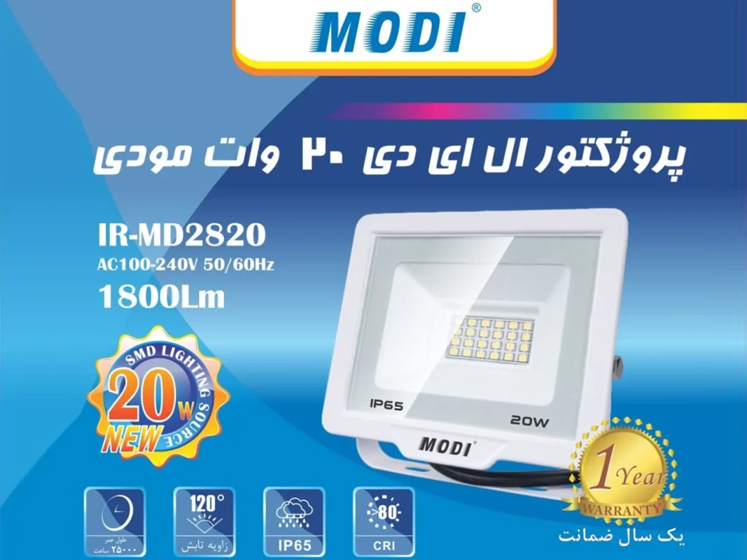 پروژکتور ۲۰ وات SMD مودی که مشاهده می کنید با مدل IR-MD2820 عرضه می شود که دارای توان مصرفی ۲۰ وات است و بسیار کم مصرف محسوب می شود . محصولات مودی بالاترین تنوع را در زمینه لوازم روشنایی ال ای دی در ایران دارد. این پروژکتور دارای قدرت نوردهی بسیار بالا و مصرف فوق العاده کم است. این پروژکتور پس از گذشت زمان و استفاده دچار اُفت نوری نمی شود. پروژکتور ۲۰ وات SMD مودی از عمر بسیار طولانی بهره می برد و قابلیت نصب بسیار آسانی دارد . میزان نوردهی این محصول ۱۸۰۰ لومن اندازه گیری شده است. می توان پروژکتورهای مودی را جایگزین مناسبی برای لامپ های خیاری و مدادی پرمصرف قدیمی قرار داد.