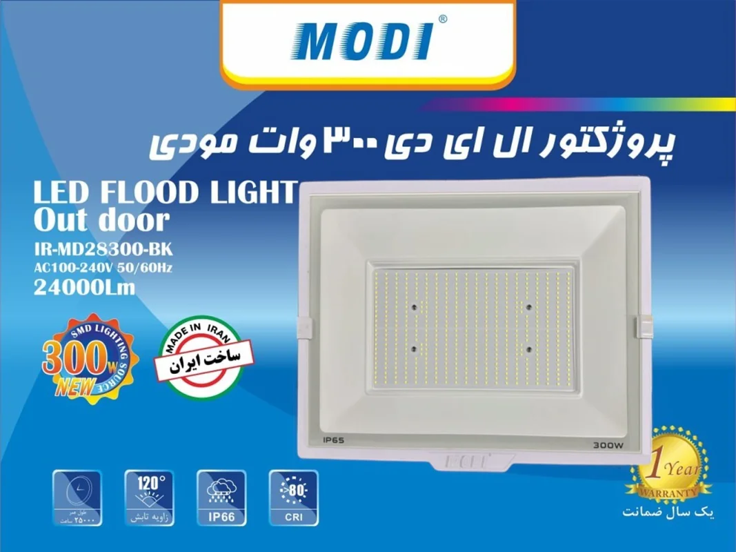 پروژکتور ۳۰۰ وات SMD مودی که مشاهده می کنید با مدل IR-MD28300 عرضه می شود که دارای توان مصرفی ۳۰۰ وات است و بسیار کم مصرف محسوب می شود . محصولات مودی بالاترین تنوع را در زمینه لوازم روشنایی ال ای دی در ایران دارد. این پروژکتور دارای قدرت نوردهی بسیار بالا و مصرف فوق العاده کم است. این پروژکتور پس از گذشت زمان و استفاده دچار اُفت نوری نمی شود. پروژکتور ۳۰۰ وات SMD مودی از عمر بسیار طولانی بهره می برد و قابلیت نصب بسیار آسانی دارد . میزان نوردهی این محصول ۲۴۰۰۰ لومن اندازه گیری شده است. می توان پروژکتورهای مودی را جایگزین مناسبی برای لامپ های خیاری و مدادی پرمصرف قدیمی قرار داد.
