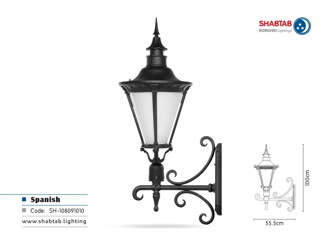 ویژگیهای چراغ اسپانیایی: بدنه محکم و بادوام از جنس آلومینیوم دارای سرپیچ استاندارد سرامیکی آب بندی مناسب در فضای بیرون سهولت در نصب و نگهداری بازدهی مناسب نور رنگ پودری الکترواستاتیک (مقاوم در برابر UV)