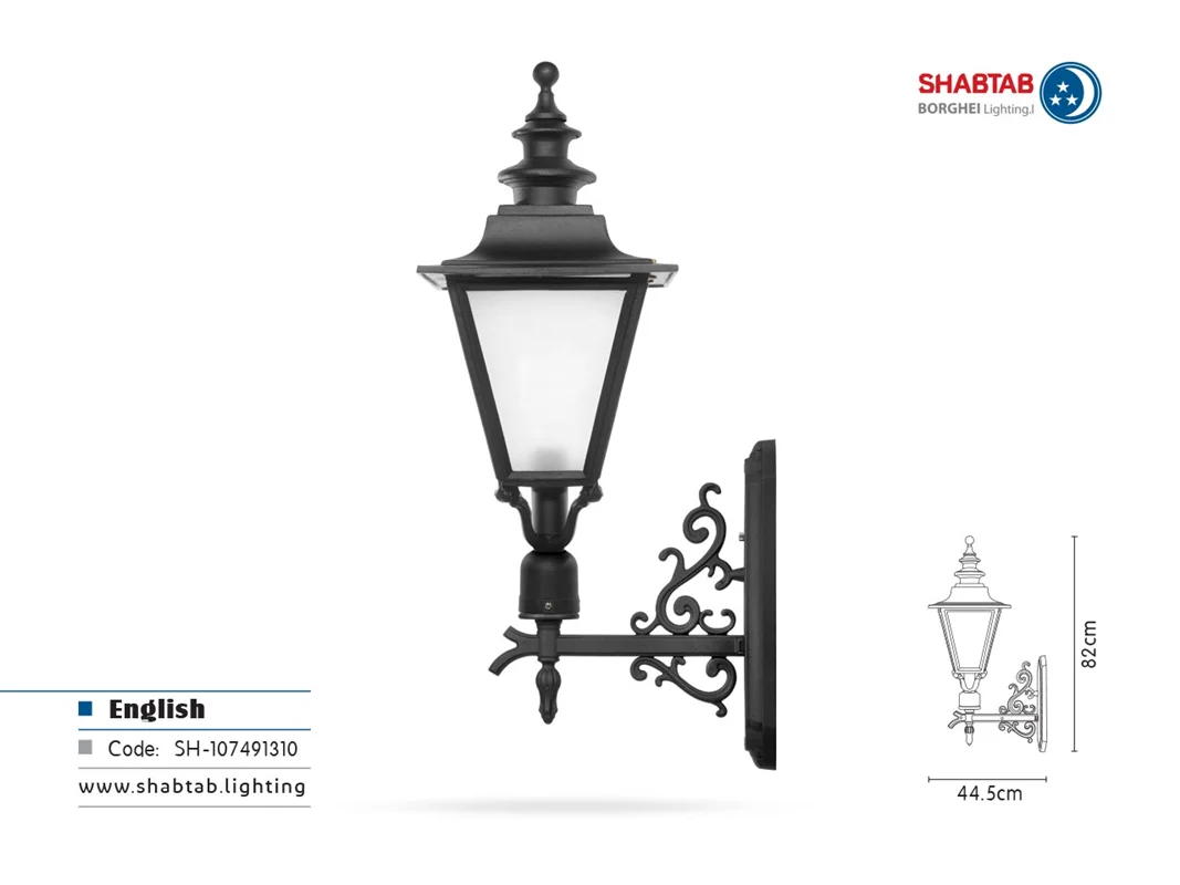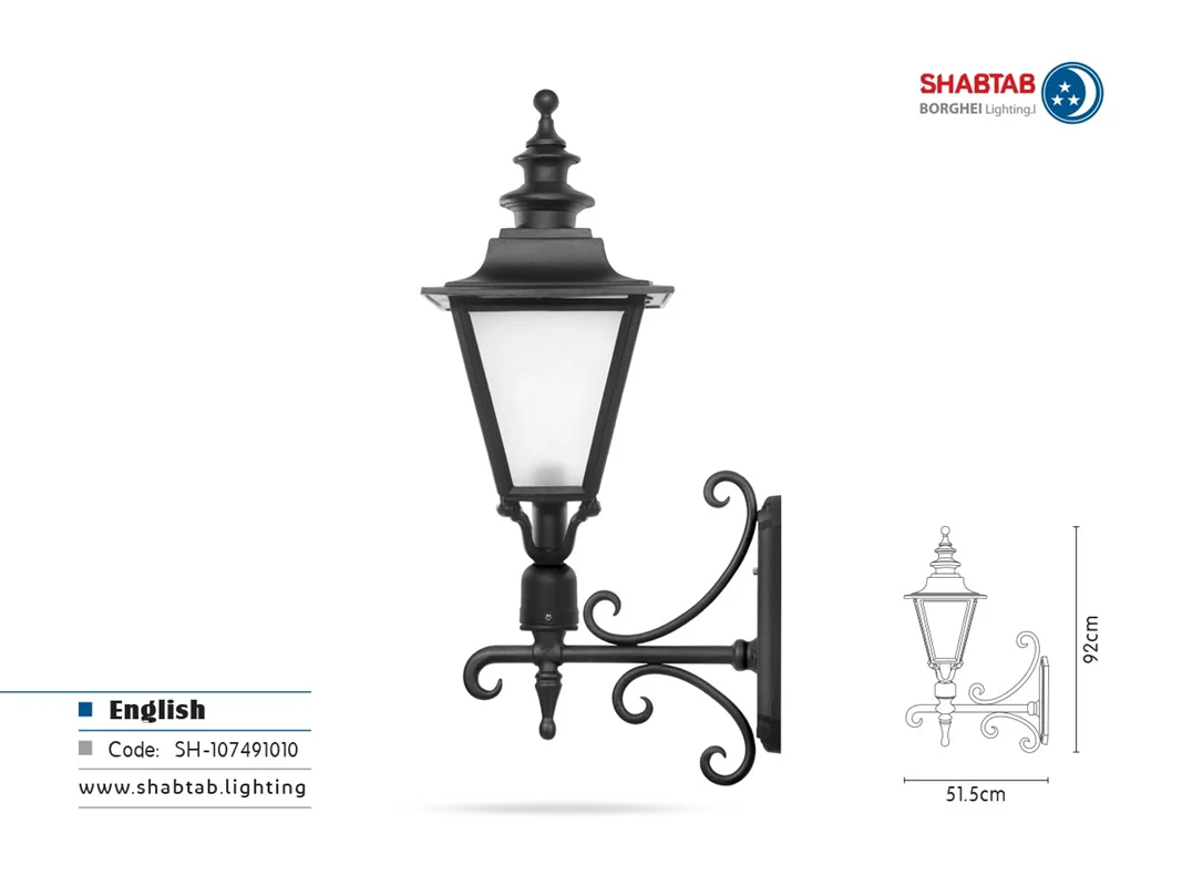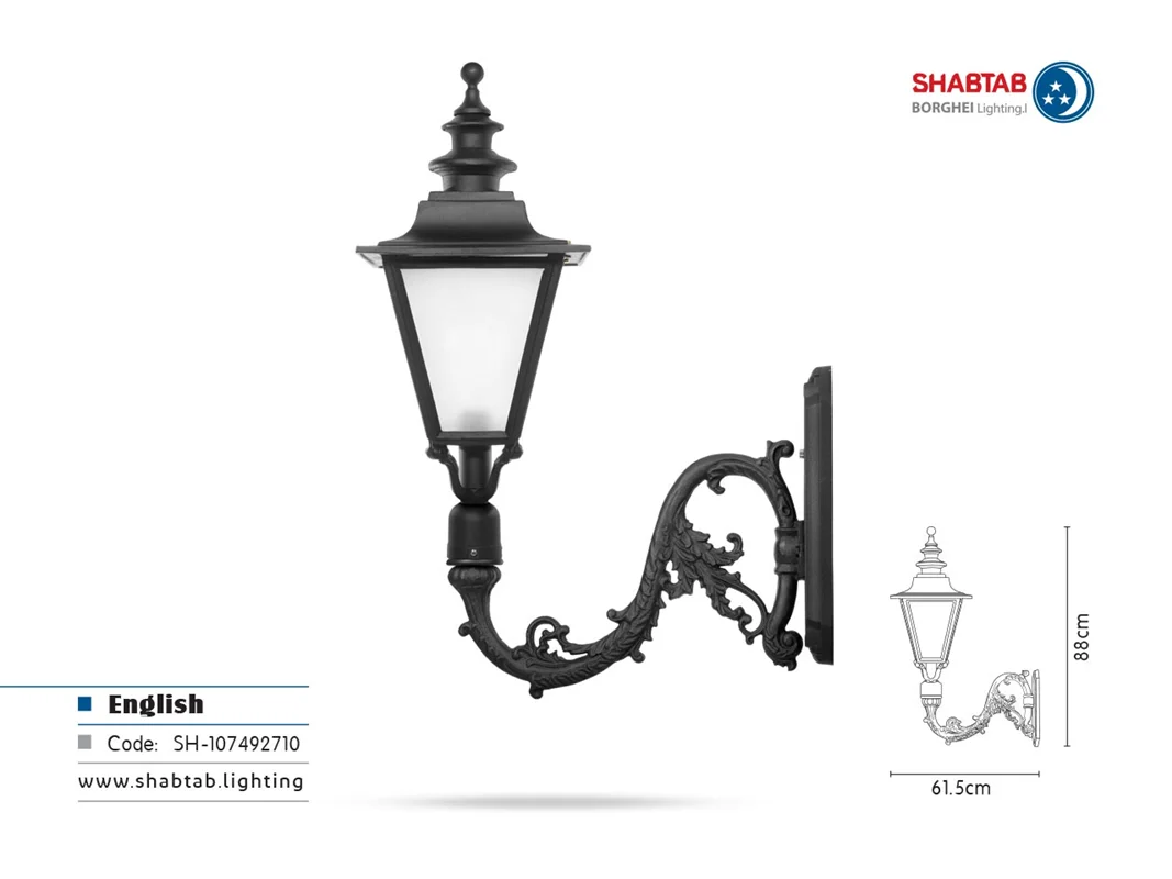 ویژگی‌های چراغ انگلیسی: بدنه محکم و بادوام از جنس آلومینیوم  دارای سرپیچ استاندارد سرامیکی  آب بندی مناسب در فضای بیرون  رنگ پودری الکترواستاتیک (مقاوم در برابر UV)  سهولت در نصب و نگهداری  بازدهی مناسب نور