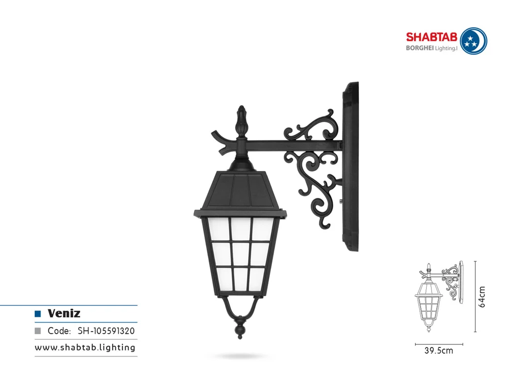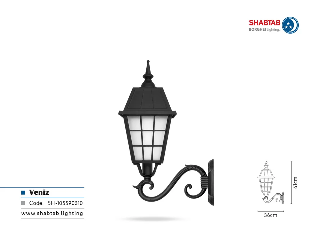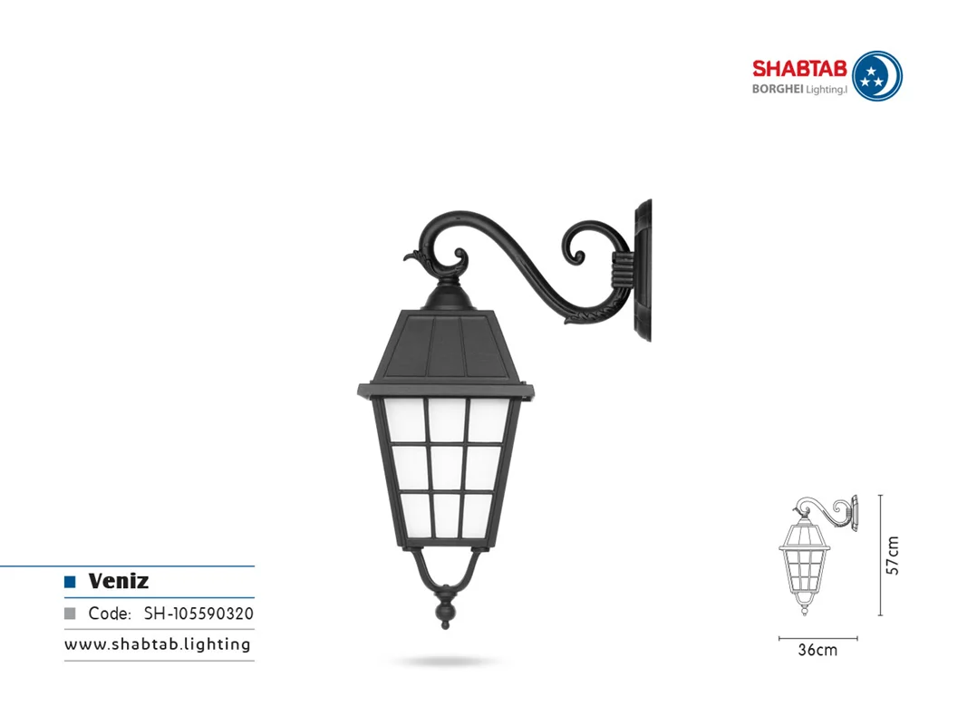 ویژگیهای چراغ ونیز: حباب نیمه شفاف PMMA مقاوم در برابر UV پوشش رنگ پودری الکترواستاتیک (مقاوم در برابر UV) دارای سرپیچ استاندارد سرامیکی بدنه آلومینیوم دایکست مستحکم آب بندی مناسب در فضای بیرون سهولت در نصب و نگهداری بازدهی عالی نور