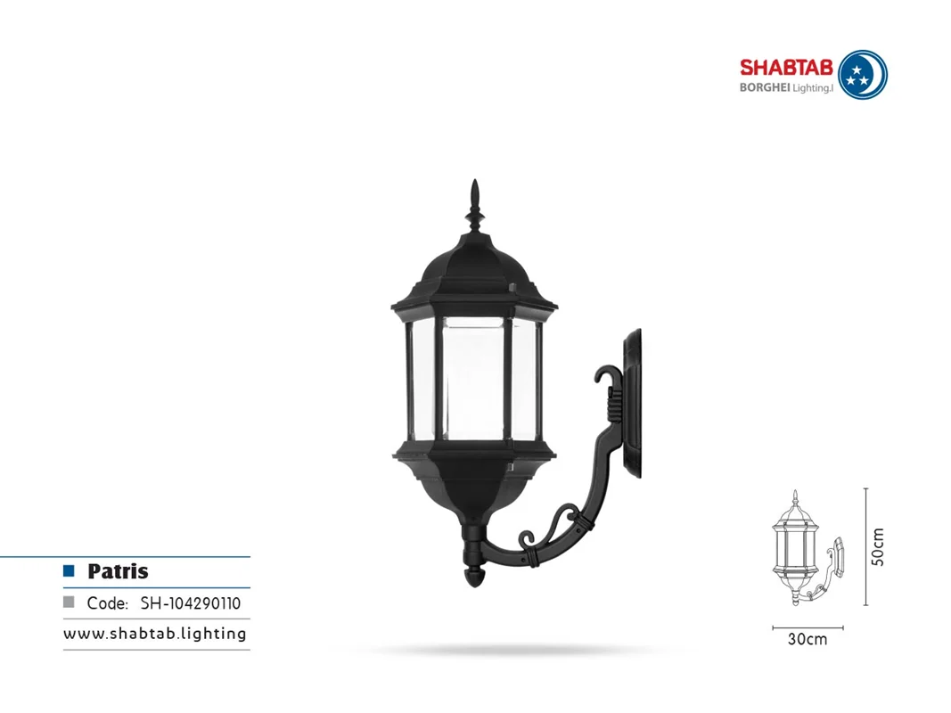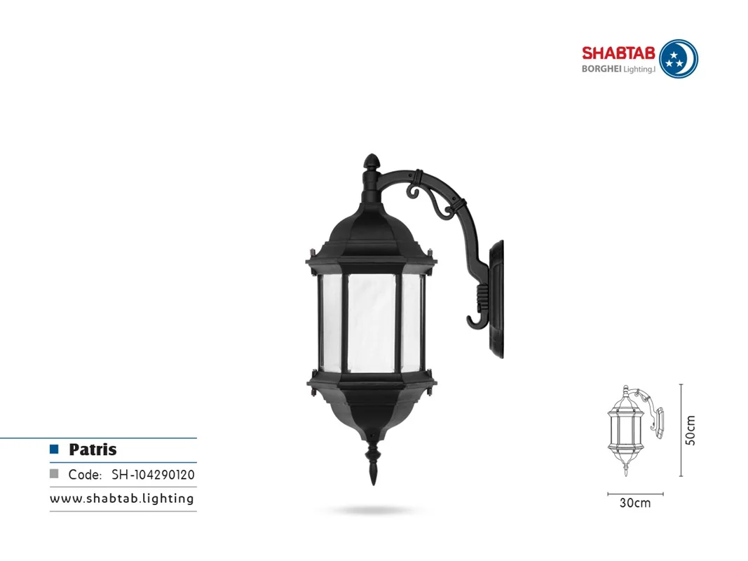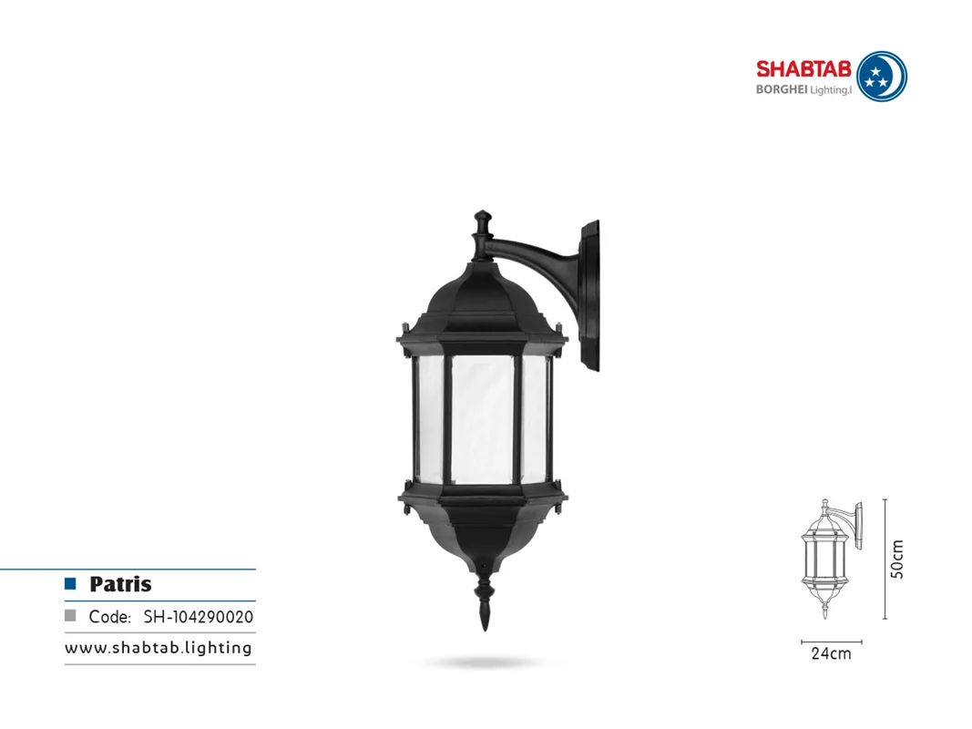 ویژگیهای چراغ پاتریس: حباب شیشه ای دور تراش نصب و نگهداری آسان دارای سرپیچ استاندارد سرامیکی بدنه محکم از جنس آلومینیوم دایکست آب بندی مناسب در فضای بیرون پوشش رنگ پودری الکترواستاتیک (مقاوم در برابر UV) بازدهی عالی نور
