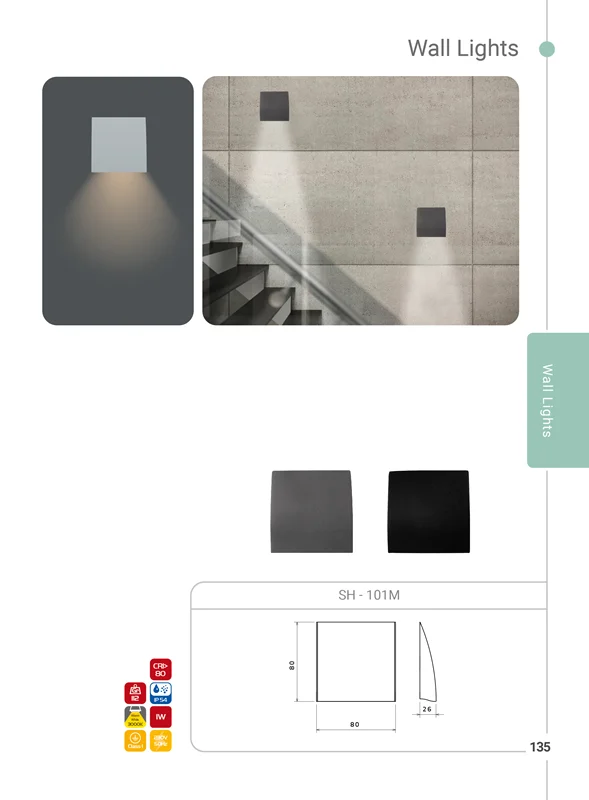 چراغ دیواری SH-101 : بدنه چراغ از جنس آلومینیوم و ولتاژ ورودی چراغ 230 ولت منبع نور چراغ ال ای دی از نوع smd با توان مصرفی 12وات و با درجه حفاظتی IP54 با توجه به درجه حفاظتی این چراغ میتوان از آن برای نورپردازی فضای داخلی و بیرونی استفاده کرد.