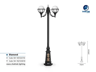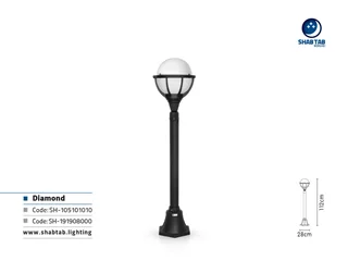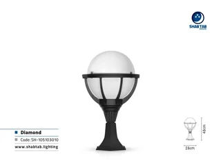 ویژگیهای چراغ دیاموند: استفاده از نوار سیلیکونی بین حباب و بدنه جهت جلوگیری از نفوذ آب و گرد و غبار حباب مقاوم در در برابر UV و ضربه دارای سرپیچ استاندارد سرامیکی دارای بدنه محکم از جنس آلومینیوم دایکست پوشش بدنه رنگ پودری الکترواستاتیک (مقاوم در برابر UV) بازدهی مناسب نور نصب و نگهداری آسان