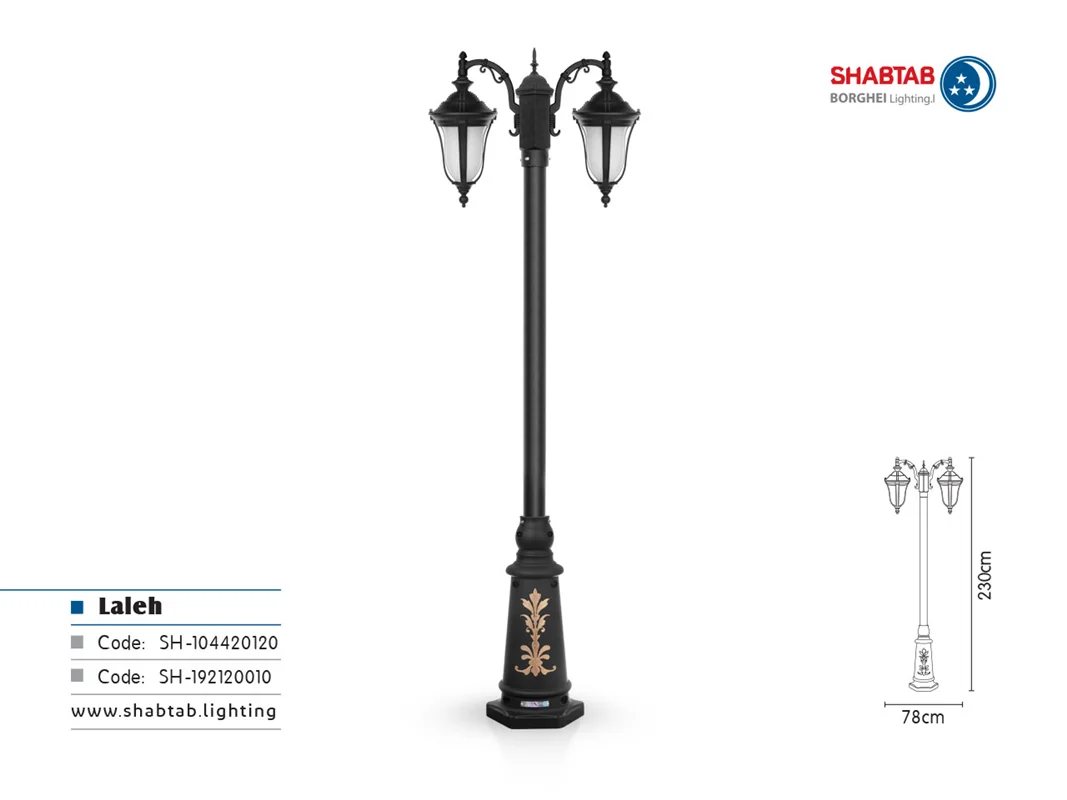 چراغ شب تاب مدل لاله با شاخه ی زیبای مدل کلاسیک و فانتزی سربالا و سرازیر و پایه چراغ سرو و ترنج ترکیب می شود و کالکشن دیدنی چراغ های محوطه ای شب تاب را کامل می کند. چراغ لاله در چهار رنگ جذاب برنز، سفید، مسی و مشکی به بازار عرضه شده است که می توانید به راحتی و متناسب با رنگ غالب باغ و محوطه ی ویلا و هم چنین رنگ المان های موجود در باغ مثل آبشار، فواره، استخر و گیاهان و فضای سبز، بهترین انتخاب را داشته باشید.