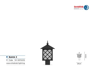 ویژگی‌های چراغ کارن 1: حباب PMMA مقاوم در برابر UV دارای سرپیچ استاندارد سرامیکی پوشش رنگ پودری الکترواستاتیک (مقاوم در برابر UV) بازدهی مناسب نور آب بندی مناسب در فضای بیرونی سهولت در نصب و نگهداری